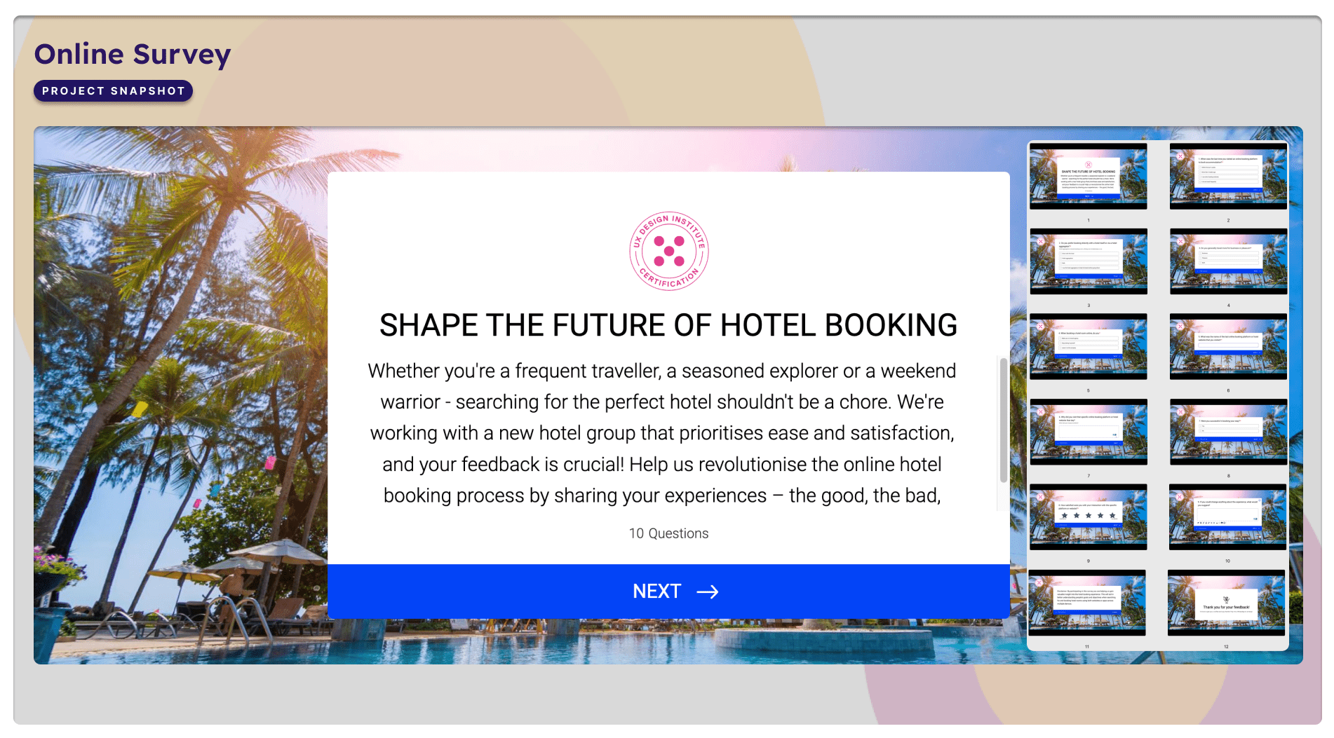 Using a combination of qualitative and quantitative methods including online surveys, usability testing, user interviews and detailed note-taking. I was able to gain a holistic view of the target user’s goals, behaviours, and the context in which they interact with online hotel booking platforms.